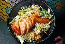230 г • запеченное крыло фаршированное сыром чеддер и креветкой, листья романо, начос, пармезан , соус цезарь