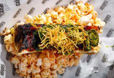 140 г • угорь, пончик, кукуруза, сливочный сыр, попкорн, соус терияки