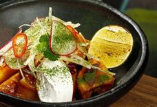 430 г • филе бычка, картофельное пюре, кукуруза, салат куртидо, халапеньо, криспи лук, киви сальса верде